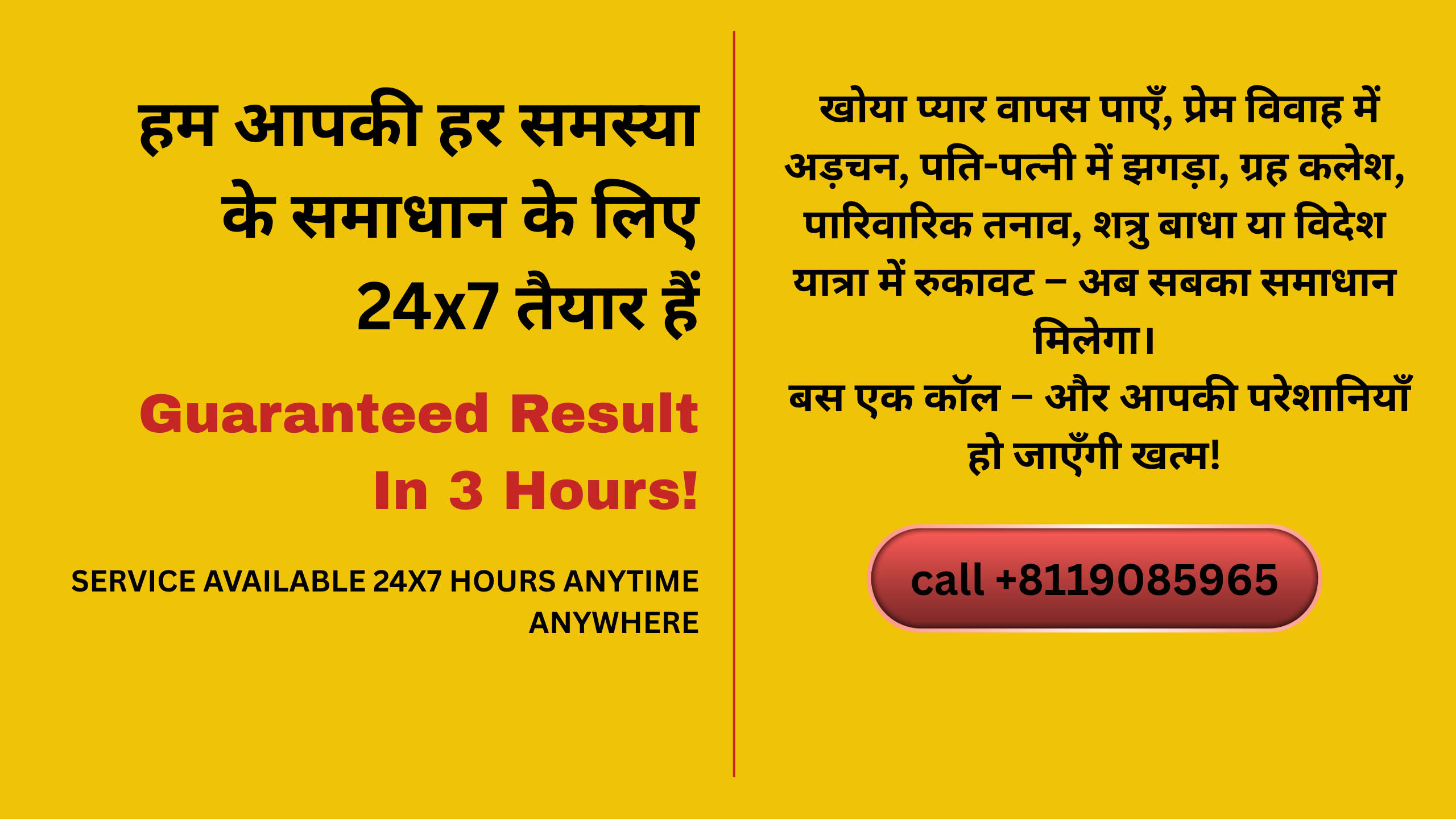 समस्या कैसी भी घबराये नहीं तुरंत हमसे सम्पर्क करे और समाधान पाए !! रूठे प्रेमी प्रेमिका को मनाना, पति पत्नी में अनबन, मनचाहा खोया प्यार पाए, पारिवारिक समस्या, माता पिता को शादी के लिए राज़ी करना, सौतन से छुटकारा आदि !! सभी समस्याओ का हल सिर्फ एक फ़ोन कॉल !!